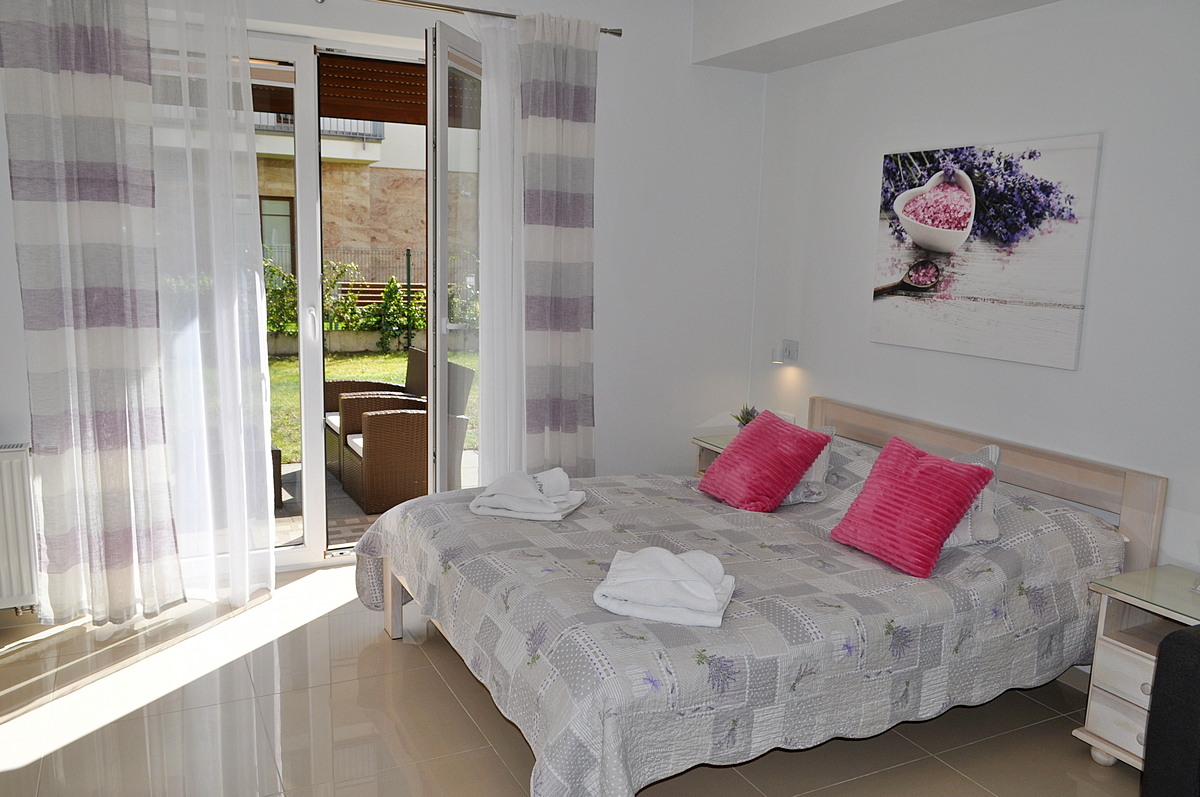 Apartament dysponuje tarasem, częścią wypoczynkową, otwartym w pełni wyposażonym aneksem kuchennym oraz łazienką z pralka.