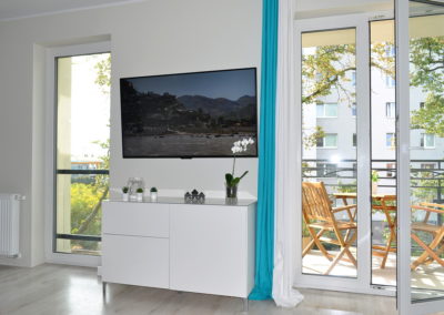 Apartament dysponuje balkonem, częścią wypoczynkową, otwartym w pełni wyposażonym aneksem kuchennym oraz łazienką.