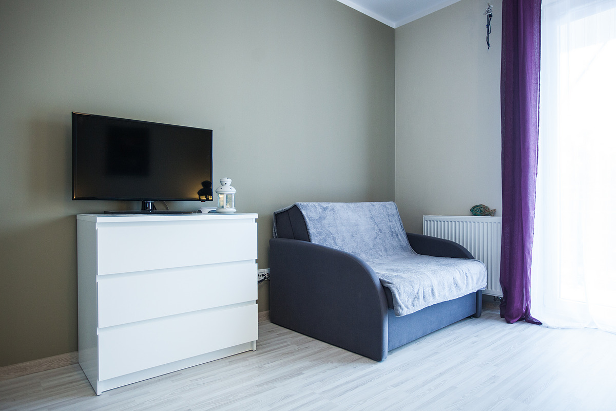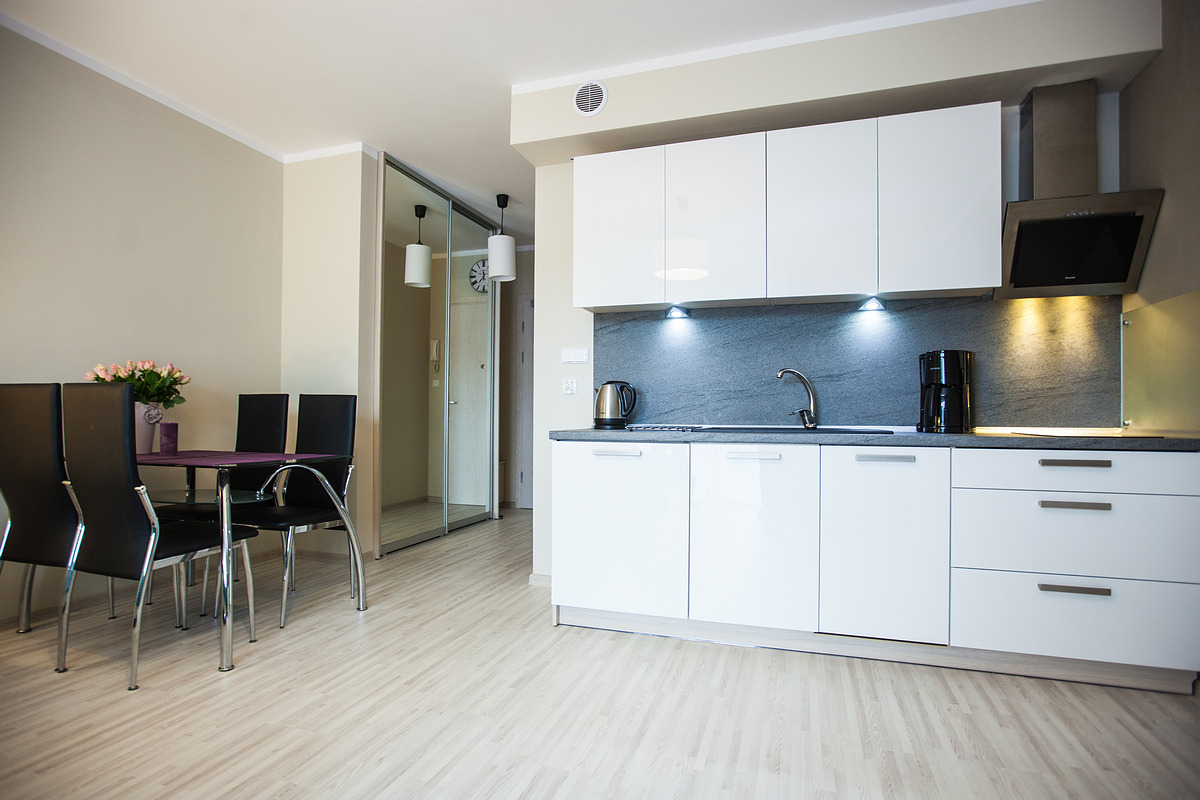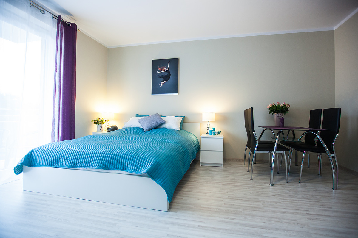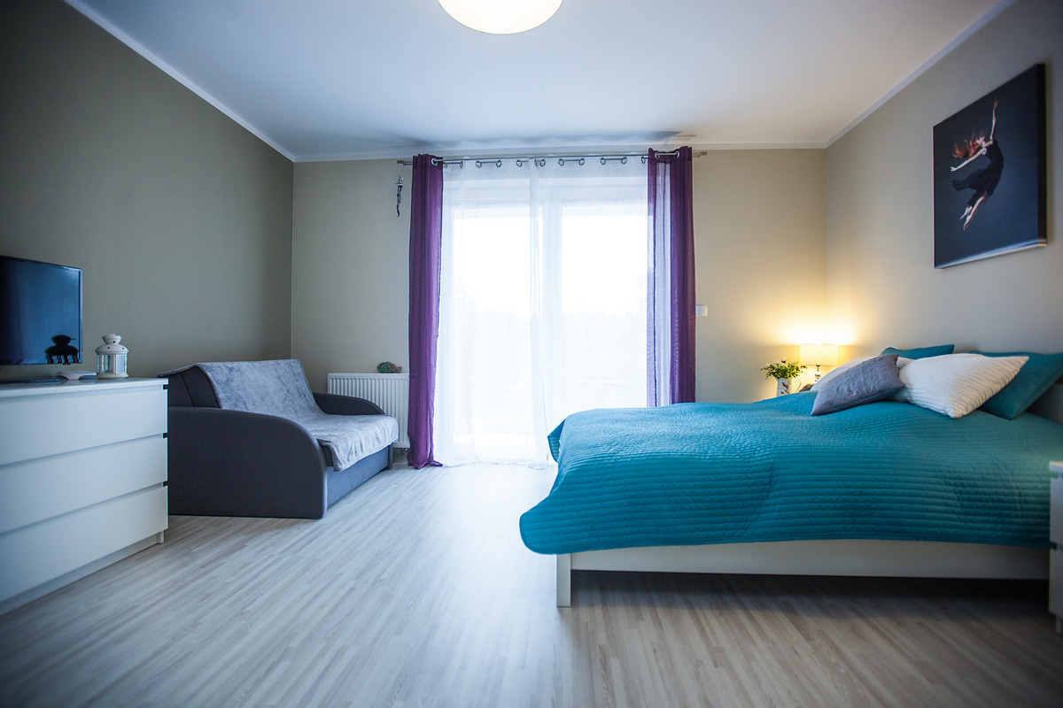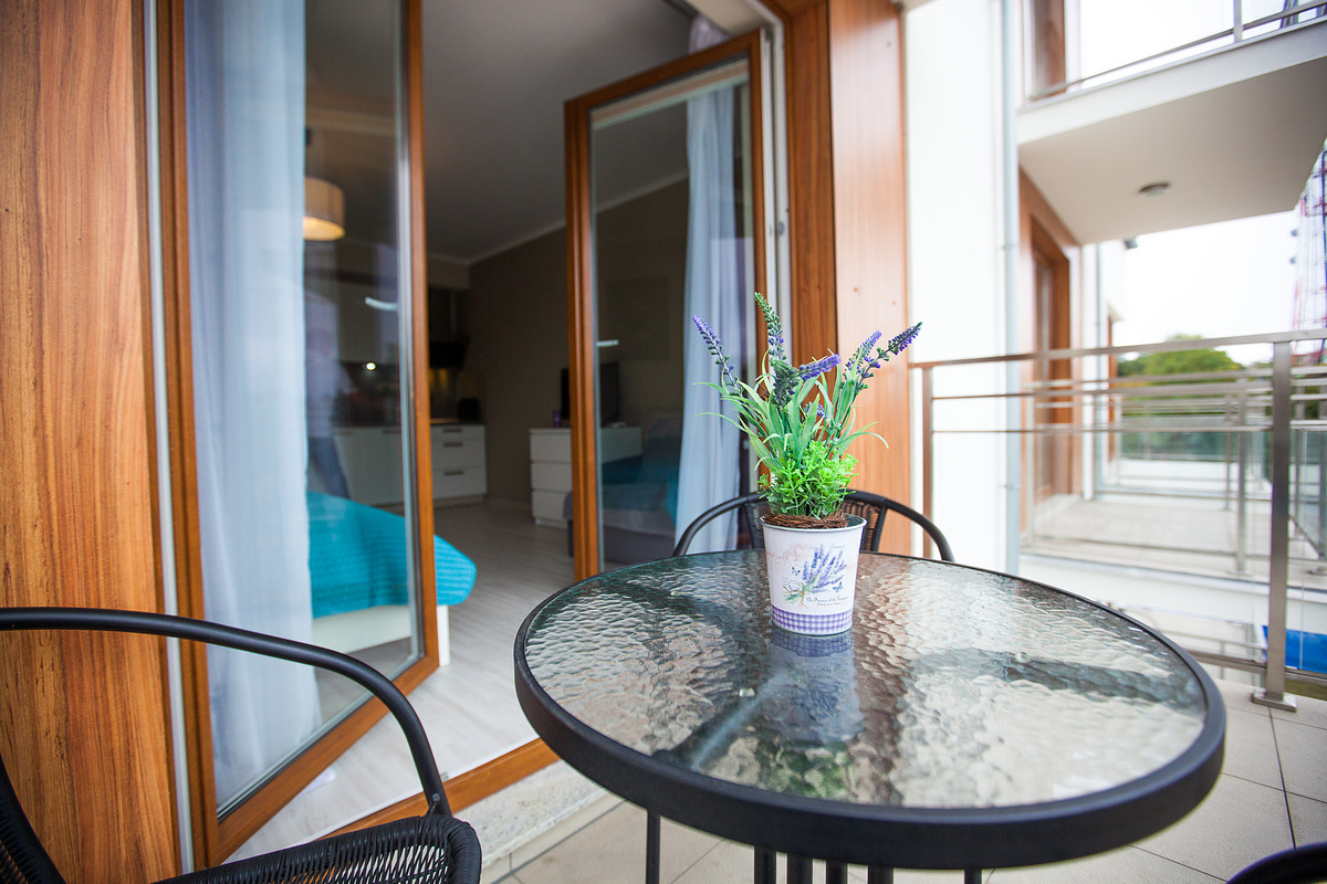 Apartament dysponuje balkonem, częścią wypoczynkową, otwartym w pełni wyposażonym aneksem kuchennym oraz łazienką z pralka.