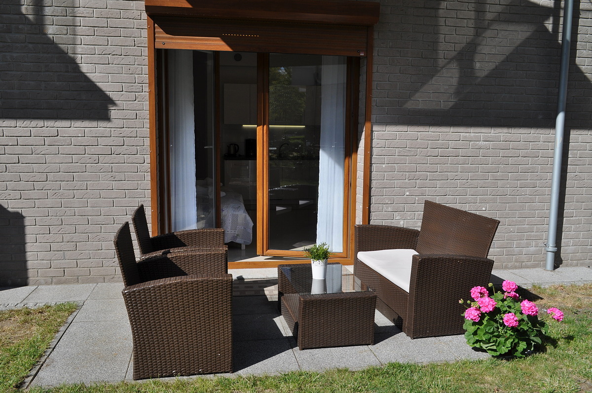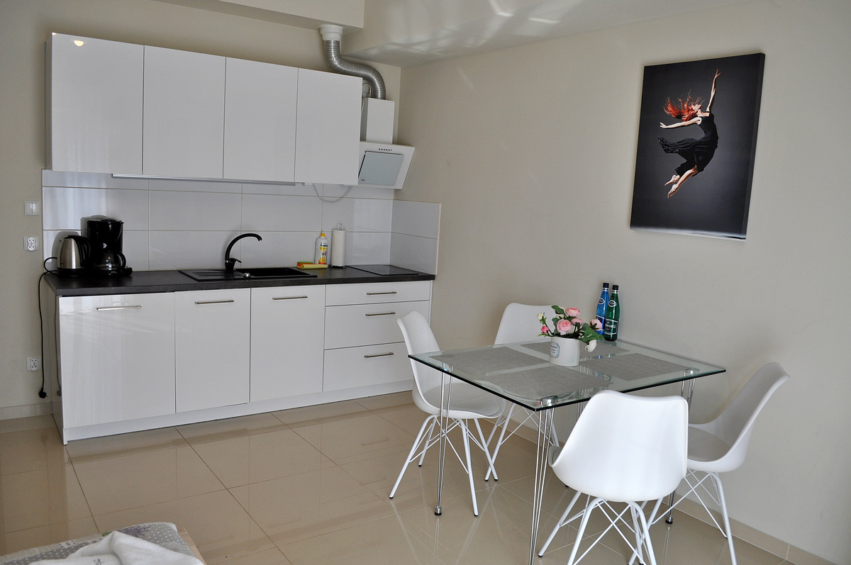 Apartament dysponuje balkonem, częścią wypoczynkową, otwartym w pełni wyposażonym aneksem kuchennym oraz łazienką z pralka.